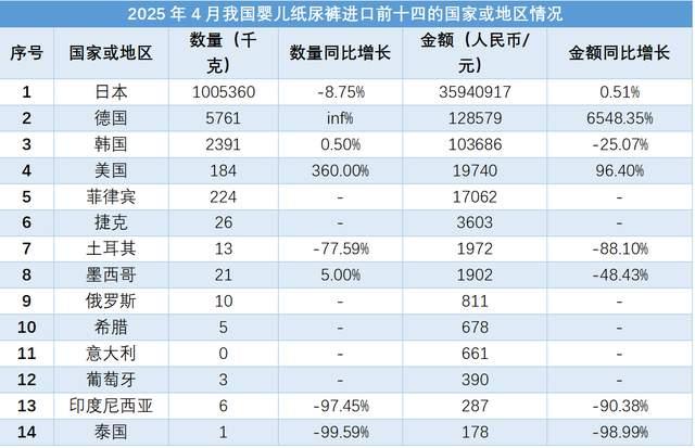 從進(jìn)口來(lái)源地來(lái)看,2025年4月份我國(guó)嬰兒紙尿褲進(jìn)口金額前10的國(guó)家或地區(qū)依次是日本、德國(guó)、韓國(guó)、美國(guó)、菲律賓、捷克、土耳其、墨西哥、俄羅斯和希臘。