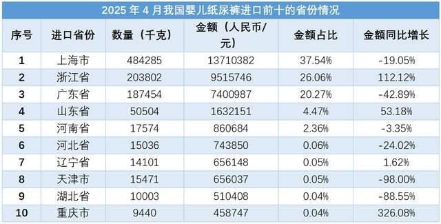 從進(jìn)口省份來(lái)看,2025年4月份我國(guó)嬰兒紙尿褲進(jìn)口金額前5的省份分別為上海市、浙江省、廣東省、山東省和河南省。